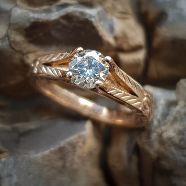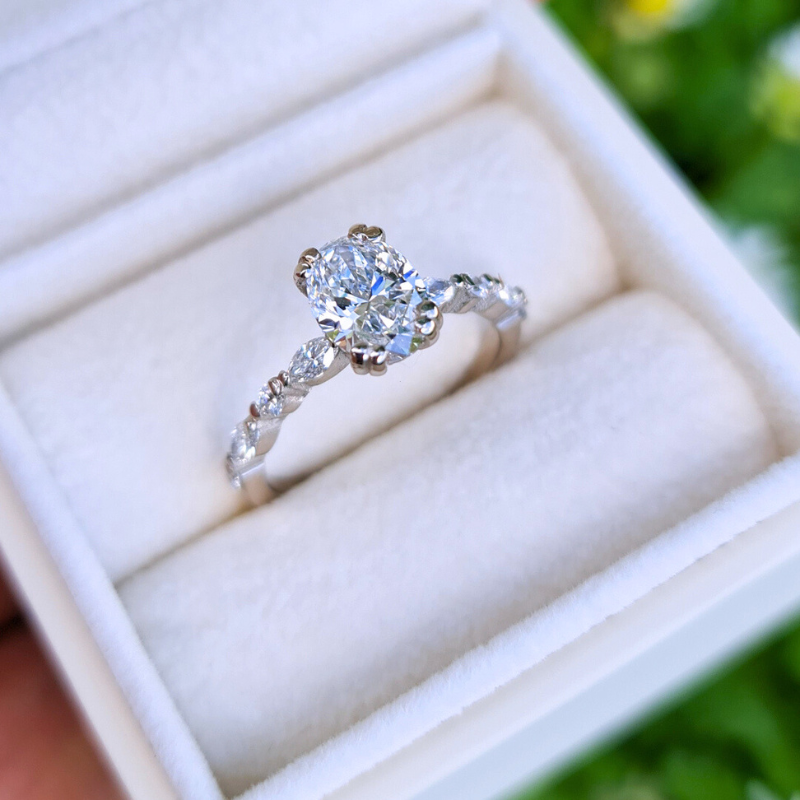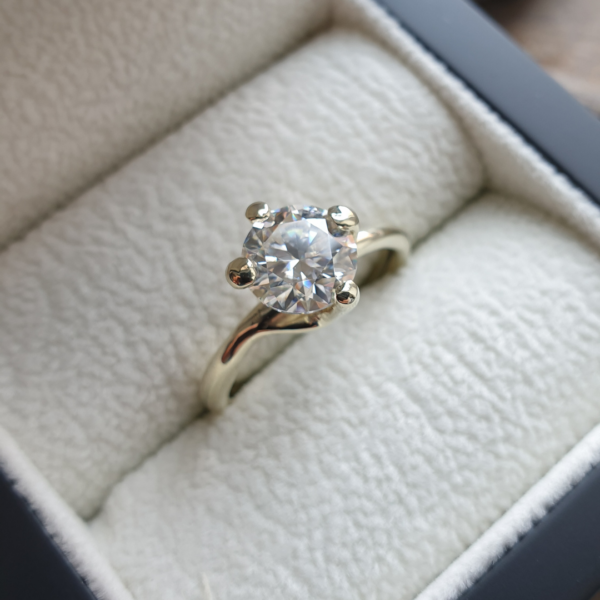 Хотя бриллиант — классический и самый популярный камень для помолвочного кольца, в последние годы муассанит также приобрел популярность. Это очень прочный камень, который стоит значительно дешевле бриллианта (даже дешевле синтетического, что позволяет выбрать более крупный камень при меньшем бюджете), и при этом обладает более мощным фейерверком и блеском, чем бриллиант! Муассанит преломляет свет сильнее, и некоторым нравится его «вау-эффект».